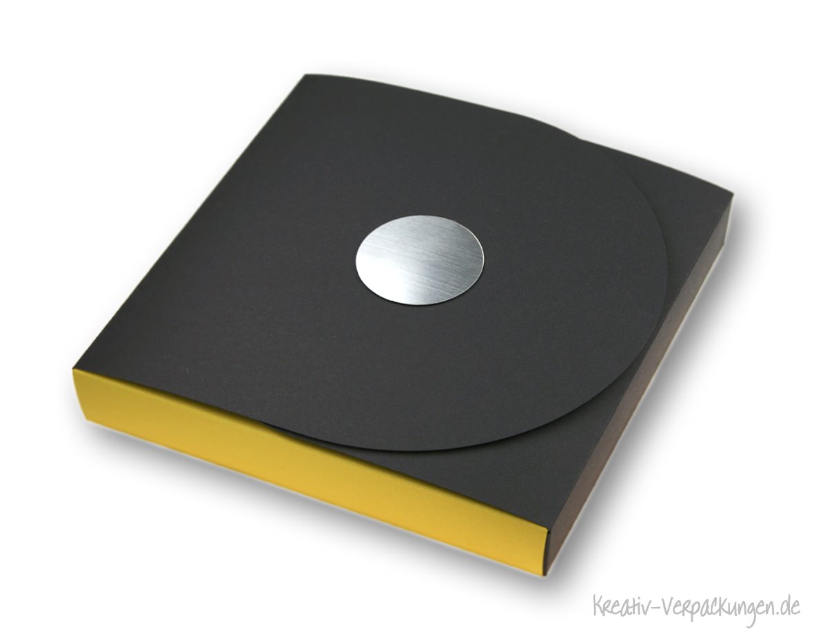 Rundes Gravurschild silbermetallic auf einer Magnet-Klappdeckelverpackung in schwarz/gelb.
