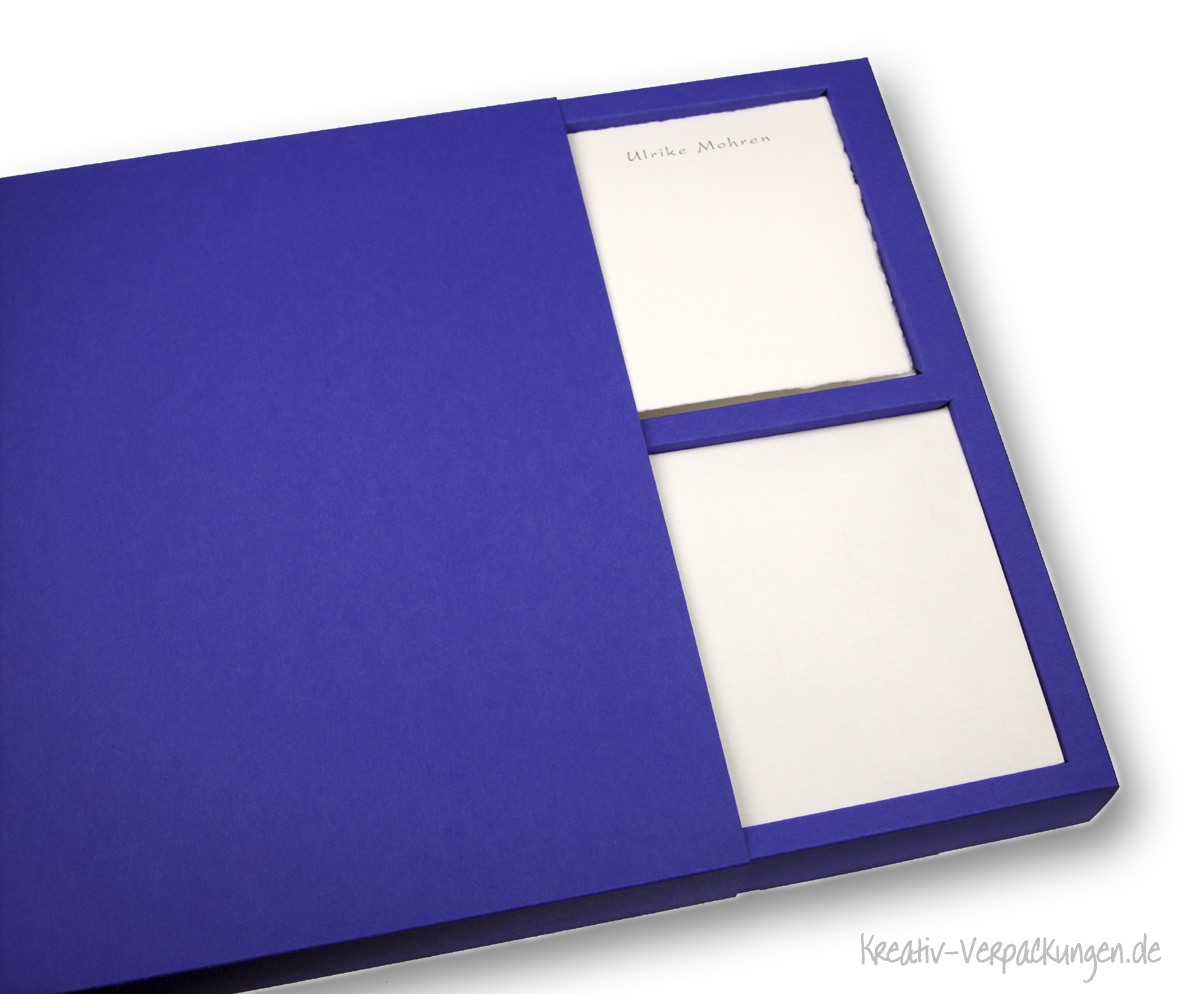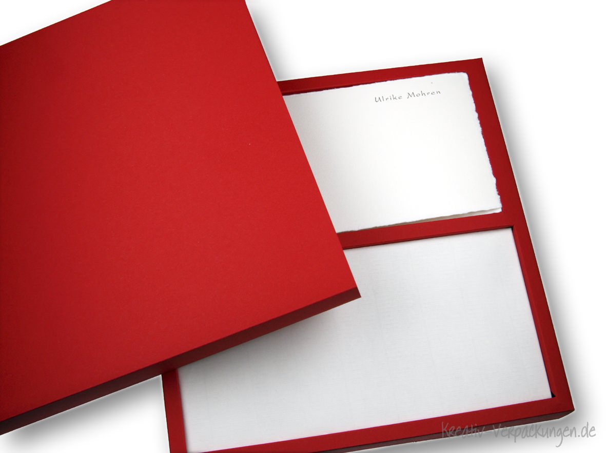 Eine Geschenkverpackung für besonderes Briefpapier und passende Kuverts - in verschiedenen Farbvarianten und alternativ mit einem Gravurschild in Silbermetallic.