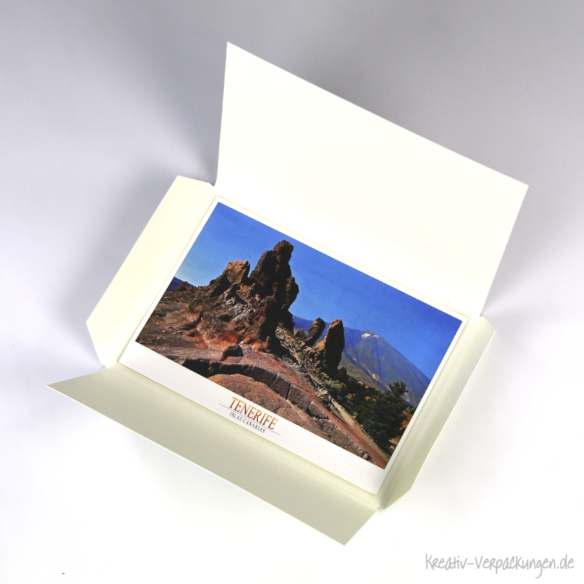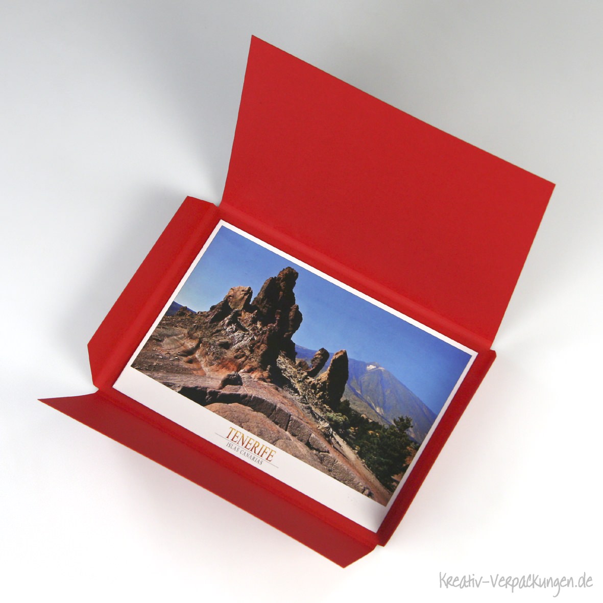 Eine weitere Postkartenverpackung mit den Sondermaßen 150 x 107 x 18 mm (LxBxH) wurde als Variante der Designverpackung 110 im Kundenauftrag angefertigt.