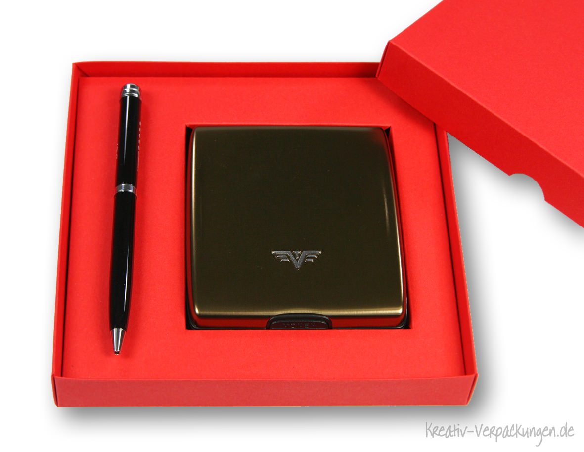Als Geschenkset für eine Moneybox zusammen mit einem Stift haben wir eine Stülpdeckelverpackung aus Karton mit einer Kartoneinlage in gleicher Farbe ausgestattet. Besonders edel wirkt in so einem Fall noch eine zusätzliche Prägung (z. B. des Firmenlogos) auf dem Deckel.