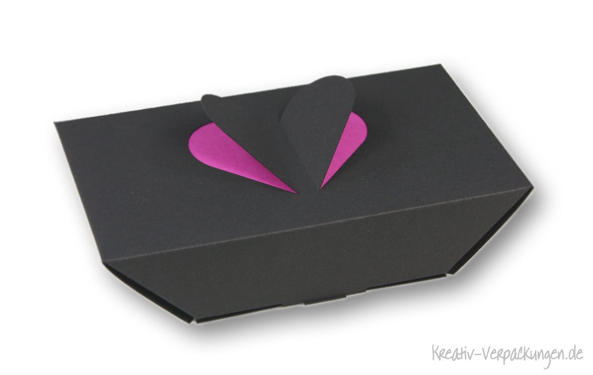 Die Herzform ist im Verschluss der Geschenkverpackung, dem Kartonmaterial oder einem ausklappbaren Ausschnitt sichtbar.