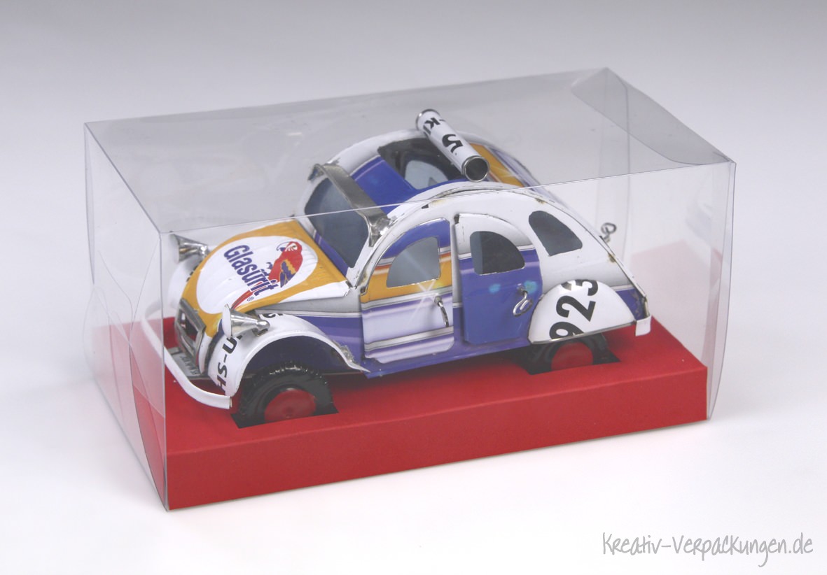 Eine passgenau abgeänderte Designverpackung 110 mit Sichtfenster und eingelegter Transparentfolie ist ein Lösungsvorschlag für eine attraktive Geschenkverpackung dieses speziellen Modellautos.