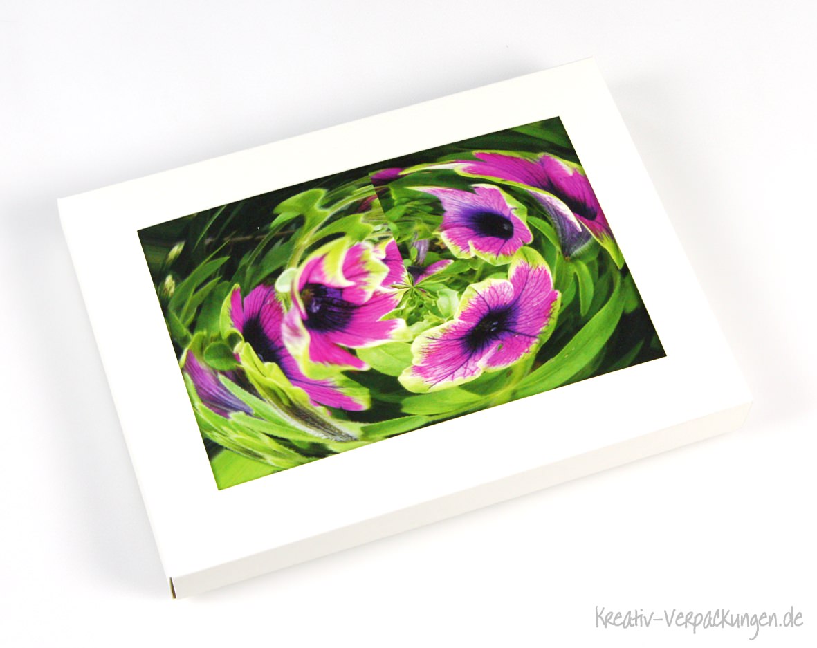 Eine weitere Postkartenverpackung mit den Sondermaßen 150 x 107 x 18 mm (LxBxH) wurde als Variante der Designverpackung 110 im Kundenauftrag angefertigt.