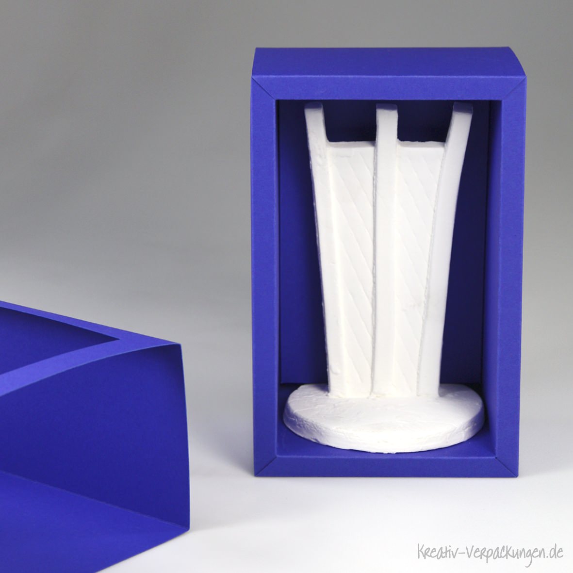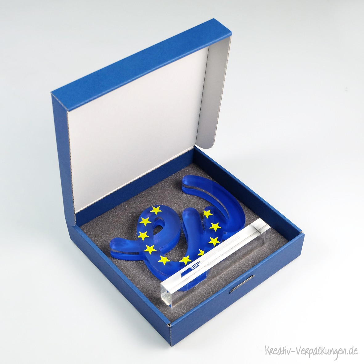 Diese Trophäe wird in einer bezogenen Stülpdeckelbox mit Schaumstoffeinlagen überreicht. Die Einlagen sind genau auf das Objekt zugeschnitten und sichern den wertvollen Preis beim Transport.