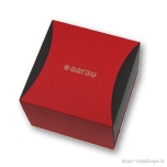 Logogravur einer Schiebe-Geschenkbox aus Karton in Sonderformat mit einer roten Halbmond-Schiebehülle.