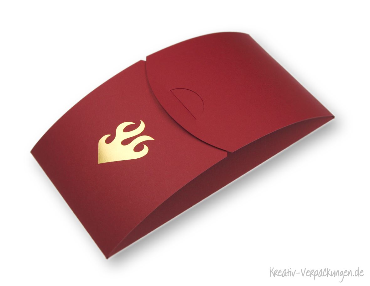 Heißprägung mit Goldfolie auf einer Designverpackung 157 in der Farbe dunkelrot.