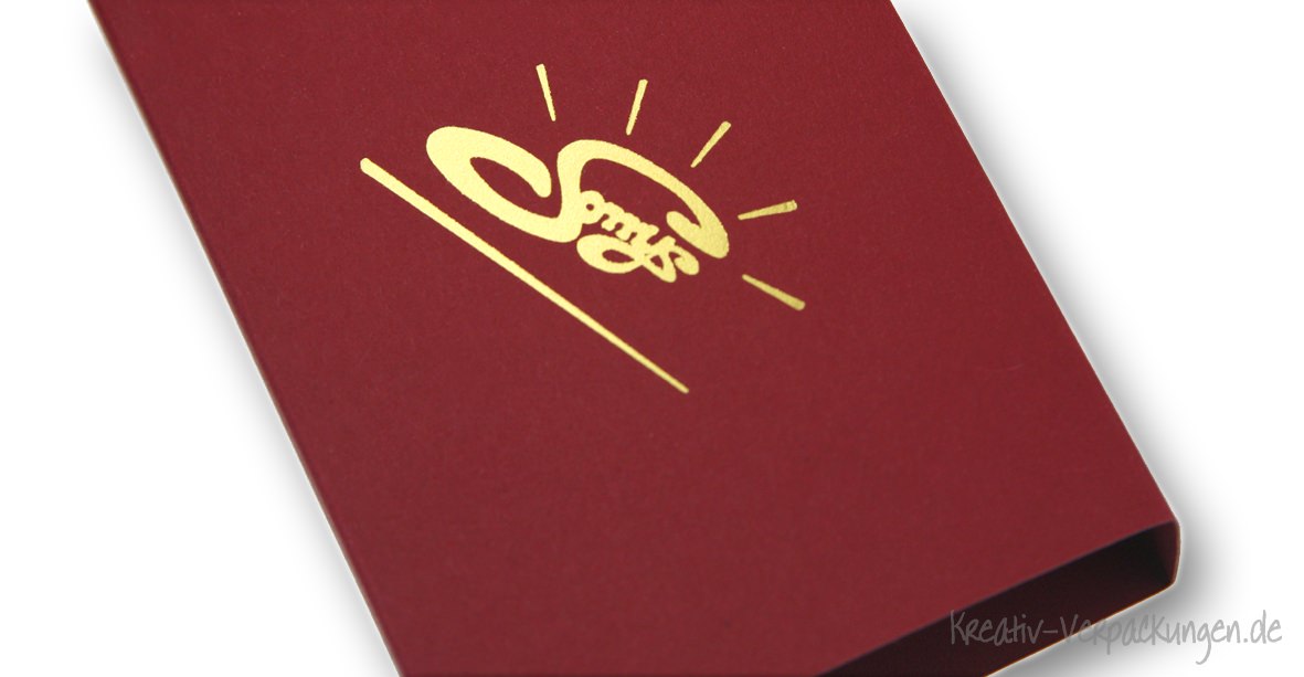 Goldprägung auf einer Schiebehülle in dunkelrot.